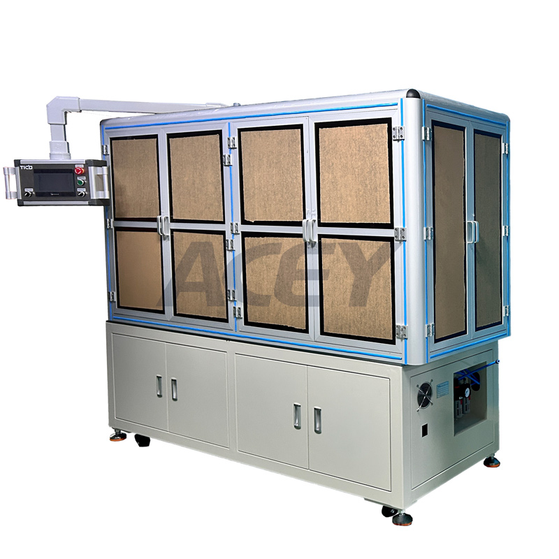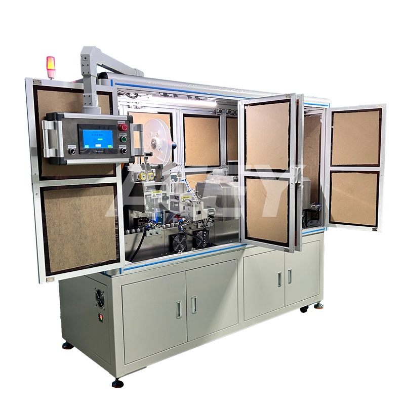 Автоматическая машина ACEY-ASM-1C с защитной крышкой предназначена для автоматической намотки термоусадочных трубок на литиевые аккумуляторы типоразмеров AA, AAA, цилиндрические аккумуляторы типоразмеров 18650, 21700, 26650 и другие литиевые аккумуляторы в стальном корпусе. Машина автоматически надевает термоусадочные трубки на аккумуляторы с помощью сервопривода, пробивает отверстия и вставляет в трубки изоляционные прокладки, после чего аккумуляторы проходят через термоусадочную печь, где они вращаются для равномерной усадки. После этого отдельная секция позволяет наносить струйную маркировку, а готовые аккумуляторы выгружаются в буферную станцию. После заполнения буферной станции аккумуляторы автоматически укладываются в пластиковые лотки.