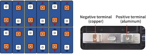 Обычно отрицательный электрод литий-ионных элементов использует медный металл, а положительный электрод — алюминиевый металл. Расположение элементов внутри модуля проектируется в соответствии с требуемым напряжением и емкостью аккумуляторной батареи.