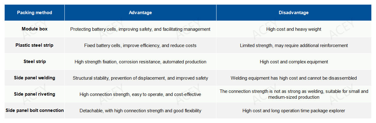 Метод упаковки модуля имеет важное влияние на производительность, безопасность и эффективность производства модуля. Обычные методы упаковки включают: модульную коробку, пластиковую стальную полосу, стальную полосу, сварку боковой панели или заклепку или болтовое соединение