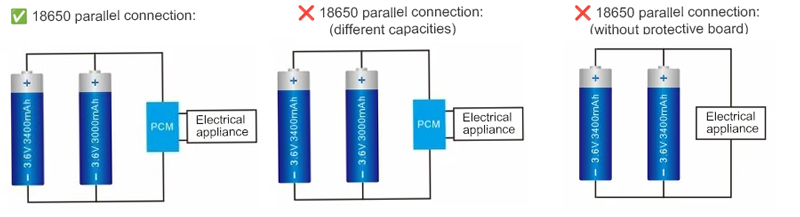 В целях безопасности литиевые аккумуляторы должны быть подключены к внешней защитной пластине для контроля состояния каждого элемента. Параллельная работа, как правило, не рекомендуется. При параллельной работе параметры аккумуляторов (ёмкость, внутреннее сопротивление и т. д.) должны быть одинаковыми. Кроме того, параметры последовательно соединённых аккумуляторов также должны быть одинаковыми. В противном случае производительность аккумуляторной батареи будет значительно ниже, чем у одноэлементной.