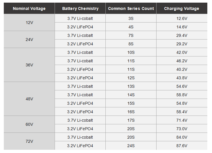 Например, 7,4 В, 12 В, 24 В, 36 В, 48 В, 60 В, 72 В и т. д.