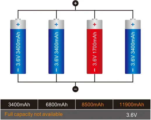 При необходимости элементы емкостью 2000 мАч могут быть собраны в аккумуляторные блоки емкостью 2*(N) Ач (N: количество элементов).